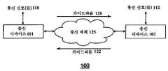 지금 도 1을 참조하면, 가이드파 통신 시스템의 일 예시적인, 비제한적인 실시예를 예시하는 블록도(100)가 도시된다. 동작시, 송신 디바이스(101)는 통신 네트워크 또는 다른 통신 디바이스로부터 데이터를 포함하는 하나 이상의 통신 신호들(110)을 수신하고 송신 매체(125)를 통해 데이터를 송신 디바이스(102)에 전달하기 위해 가이드파들(120)을 생성한다. 송신 디바이스(102)는 가이드파들(120)을 수신하고 이들을 통신 네트워크 또는 다른 통신 디바이스로 송신을 위한 데이터를 포함하는 통신 신호들(112)로 변환한다. 가이드파들(120)은 위상 시프트 키잉, 주파수 시프트 키잉, 직교 진폭 변조, 진폭 변조, 직교 주파수 분할 다중화와 같은 다중 반송파 변조와 같은 변조 기술을 통해 및 주파수 분할 다중화, 시분할 다중화, 코드 분할 다중화, 상이한 파 전파 모드들을 통해 및 다른 변조 및 액세스 전략들을 통한 다중화와 같은 다중 액세스 기술들을 통해 데이터를 전달하도록 변조될 수 있다.Referring now to FIG. 1, shown is a block diagram 100 illustrating an exemplary, non-limiting embodiment of a guided wave communication system. In operation, the transmitting device 101 guides to receive one or more communication signals 110 including data from a communication network or other communication device and to transmit data to the transmitting device 102 via the