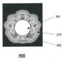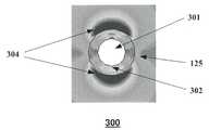 또한, 커플러들 및 송신 매체들과 같은, 가이드파 통신 시스템의 구성 요소들이 각각의 가이드파 모드에 대해 그들 자신의 차단 주파수들을 가질 수 있음이 주의되어야 한다. 차단 주파수는 일반적으로 특정 가이드파 모드가 특정 구성 요소에 의해 지원되도록 설계된 최저 주파수를 말한다. 일 예시적인 실시예에서, 도시된 특정 비대칭 모드의 전파는 이러한 특정 비대칭 모드에 대하여 낮은 차단 주파수(Fc)의 제한된 범위(예를 들어, Fc에서 2Fc) 내에 속하는 주파수를 갖는 전자기파에 의해 송신 매체(125)상에 유도된다. 낮은 차단 주파수(Fc)는 송신 매체(125)의 특징들에 대해 특정하다. 절연 재킷(302)에 의해 둘러싸인 내부 도체(301)를 포함하는 도시된 실시예들에 대해, 이러한 차단 주파수는 절연 재킷(302)의 치수들 및 속성들 및 잠재적으로는 내부 도전체(301)의 치수들 및 속성들에 기초하여 변할 수 있고 원하는 모드 패턴을 갖도록 실험적으로 결정될 수 있다. 그러나, 내부 도전체가 없는 중공 유전체 또는 절연체에 대해서도 유사한 효과들이 발견될 수 있음이 주의되어야 한다. 이러한 경우, 차단 주파수는 중공 유전체 또는 절연체의 치수들 및 속성들에 기초하여 변할 수 있다.It should also be noted that components of the guided wave communication system, such as couplers and transmission media, may have their own cutoff frequencies for each guided wave mode. The cutoff frequency generally refers to the lowest frequency at which a particular guided wave mode is designed to be supported by a particular component. In one exemplary embodiment, the propagation of a particular asymmetrical mode shown is transmitted by an electromagnetic wave having a frequency that falls within a limited range of low cutoff frequency Fc (e.g., Fc to 2Fc) for this particular asymmetrical mode. 125). The low cutoff frequency Fc is specific for the characteristics of the