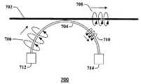 비제한적인 예시에서, 도전성 매체들에 의해 전송 디바이스와 수신 디바이스 사이에 전기 신호들을 송신 및 수신하는 전기 시스템들을 고려하자. 이러한 시스템들은 일반적으로 전기적으로 별개의 포워드 및 리턴 경로들에 의존한다. 예를 들면, 절연체에 의해 분리되는 접지 차폐 및 중심 도전체를 갖는 동축 케이블을 고려하자. 일반적으로, 전기 시스템에서, 전송(또는 수신) 디바이스의 제 1 단자는 중심 도전체에 접속될 수 있고, 전송(또는 수신) 디바이스의 제 2 단자는 접지 차폐에 접속될 수 있다. 전송 디바이스가 제 1 단자를 통해 중심 도전체에 전기 신호를 주입하는 경우, 전기 신호는 중심 도전체를 따라 전파하여 중심 도전체에 포워드 전류들을 야기하고, 접지 차폐로 전류들을 리턴할 것이다. 동일한 조건들이 두 개의 단자 수신 장치에 적용한다.In a non-limiting example, consider electrical systems that transmit and receive electrical signals between a transmitting device and a receiving device by conductive media. Such systems generally rely on separate forward and return paths. For example, consider a coaxial cable with a ground shield and a center conductor separated by an insulator. In general, in an electrical system, a first terminal of a transmitting (or receiving) device may be connected to a center conductor and a second terminal of a transmitting (or receiving) device may be connected to a ground shield. When the transmitting device injects an electrical signal through the first terminal to the center conductor, the electrical signal will propagate along the center conductor causing forward currents to the center conductor and return currents to the ground shield. The same conditions apply to two terminal receivers.