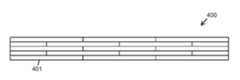 도 4a 내지 도 4c는 본 개시내용의 실시예에 따른 모듈의 에지들에서 측벽들 및 레일 접촉 플랜지들을 가지는 전자 회로 카드 모듈 커버 내의 멀티 레벨 오실레이팅 히트 파이프 구현예를 형성하기 위한 프로세스를 예시하는 일련의 다이어그램들이다.  바디(301), 측벽들(302), 및 접촉 플랜지들(303) 중 임의의 것의 섹션(400)은 도 4a 내지 도 4c에 의해 예시된 방식들로 형성될 수 있고, 그러한 구조물들 각각 내의 오실레이팅 히트 파이프들(304)은 동일한 방식으로 형성된다.  (예를 들어) 약 6밀(mil) 두께인 메탈 테이프 또는 포일(foil)(401)의 길이들은 도 4a에 도시된 바와 같이 스태거된(staggered) 겹쳐져 있는(overlapping) 층들로 함께 초음파 용접(ultrasonically welded)된다.  오실레이팅 히트 파이프들의 단면적을 수용하는(accommodating) 두께에 도달할 때까지 층들이 부가된다.  다음으로, 도 4b에 도시된 바와 같이, 오실레이팅 히트 파이프 세그먼트(305, 306, 또는 307)에 대한 채널의 형태인 개구(402)는 메탈 테이프 길이들(401)의 부분들의 제거에 의해, 집합된 층들(aggregated layers) 내에 밀링되거나(milled) 다르게 형성된다.  예를 들어, 개구(402)는 폭 및 높이가 20 내지 40밀일 수 있다.  도 4c에 도시된 바와 같이, 추가의 메탈 테이프 길이들(403)이 집합된 층들 위에 개구(402)에 걸쳐서 배치되고, 오실레이팅 히트 파이프 세그먼트(305, 306, 또는 307)를 형성하는 채널을 포위하기 위한 위치에서 초음파 용접된다.4A-4C are a series illustrating a process for forming a multi level oscillating heat pipe implementation in an electronic circuit card module cover having sidewalls and rail contact flanges at the edges of a module according to an embodiment of the disclosure. Are diagrams. The