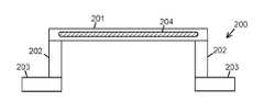 도 2 및 도 3a 내지 도 3c는 비교 목적들을 위해 서로 함께 고려될 수 있다.  도 2는 모듈의 에지들에서 측벽들 및 접촉 플랜지들을 갖는 전자 회로 카드 모듈 커버 내의 단일 평면 오실레이팅 히트 파이프 구현예의 단순화된 단면도이다.  도 3a는 본 개시내용의 실시예에 따른 모듈의 에지들에서 측벽들 및 레일 접촉 플랜지들을 가지는 전자 회로 카드 모듈 커버 내의 멀티 레벨 오실레이팅 히트 파이프 구현예의 단순화된 단면도이다.  도 3b는 도 3a의 멀티 레벨 오실레이팅 히트 파이프 구현예의 평면도로서, 플로우 채널들 외의 구조물은 가상선으로 도시된다.  도 3c는 도 3a 및 도 3b의 멀티 레벨 오실레이팅 히트 파이프 구현예의 일부의 사시도로서, 플로우 채널들 이외의 구조물은 마찬가지로 가상선으로 도시된다.  도 1a 및 도 1b에 도시된 일반적인 베이스 커버 및 히트 싱크 구조물들의 이러한 단순화된 예시들에서, 관심이 있는 구조물들은 바디, 측벽들, 및 접촉 플랜지들을 포함한다.  도 2의 전자 카드 모듈 커버(200)는 열 소산을 필요로 하는 디바이스들 및/또는 볼륨들에 접촉하는 바디(201)를 포함한다.  바디(201)의 에지들에서 (도시된 예시에서) 바디(201)로부터 수직으로 연장되는 측벽들(202)이 돌출된다.  측벽들(202)의 단부들에 (도시된 예시 내에서) 측벽들(202)에 수직이고 바디(201)와 평행인 방향으로, 바디(201)의 영역으로부터 멀어지면서 외향 연장되는 접촉 플랜지들(203)이 있다.  접촉 플랜지들(203)은 전자 카드 모듈 커버(200)가 또 다른 구조물에 고정되는 것을 가능하게 하고, 그러한 또 다른 구조물은 본 개시내용에서 과도한 열이 소산될 수 있는 영역으로의 냉벽 인터페이스인 것으로 추측된다.2 and 3A-3C can be considered together with one another for comparison purposes. 2 is a simplified cross-sectional view of a single planar oscillating heat pipe implementation in an electronic circuit card module cover with sidewalls and contact flanges at the edges of the module. 3A is a simplified cross-sectional view of a multi-level oscillating heat pipe implementation in an electronic circuit card module cover having sidewalls and rail contact flanges at the edges of the module according to an embodiment of the disclosure. FIG. 3B is a top view of the multi-level oscillating heat pipe implementation of FIG. 3A, with structures other than flow channels shown in phantom lines. FIG. 3C is a perspective view of a portion of the multi-level oscillating heat pipe implementation of FIGS. 3A and 3B, with structures other than flow channels likewise shown in phantom. In these simplified examples of the general base cover and heat sink structures shown in FIGS. 1A and 1B, the structures of interest include a body, sidewalls, and contact flanges. The electronic