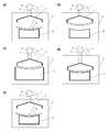 도 3은 본 발명에 따른 방법의 한 실시예의 단계를 개략적으로 도시한다.  우선, 초기 상태에서 편평하게 서로 포개지게 놓인 두 개의 유리 페인(I, II)을 중력 벤딩 몰드(9) 상에 배치하고 벤딩 챔버내로 운반한다.  유리 페인(I, II)은 벤딩 온도, 예를 들어 600 ℃로 가열되고 중력의 영향을 받아서 중력 벤딩 몰드(9)에 대해 안착된다.  가열은 예를 들어, 벤딩 챔버(8)의 일부이거나 또는 그로부터 상류에 위치한 터널로(tunnel furnace)에서 이루어진다.  벤딩 챔버(8) 내부에서는, 예비-벤딩된 유리(I, II)가 유리 페인(I, II)을 고정하기 위한 툴(1) 아래 중력 벤딩 몰드(9) 상에 위치하고 있다(파트 a).  툴(1)이 하강하고 이어서 플랩(14)이 개방됨으로써, 유리 페인(I, II) 상에 흡입 효과가 작용하며, 이에 따라 유리 페인(I, II)은 중력 벤딩 몰드(9)로부터 툴(1)과 함께 상승한다(파트 b).  이후, 전면 하부 벤딩 몰드(10)를 툴(1) 아래에 위치시킨다.  흡입 벤딩 몰드(10)는 예를 들어 암(arm)에 장착될 수 있고 툴(1)과 중력 벤딩 몰드(9) 사이에 인입될 수 있다.  유리 페인(I, II)은 툴(1)과 흡입 벤딩 몰드(10) 사이에서 프레스 벤딩에 의해 최종 형상으로 벤딩된다(파트 c).  프레스 벤딩 과정 중에, 상부 툴(1)의 흡입 효과는 차단된다.  프레스 벤딩 후, 유리 페인(I, II)은 툴(1)에 의해 다시 픽업된다.  이후, 흡입 벤딩 몰드(10)는 다시 제거되고, 유리 페인(I, II)은 툴(1)에 의해 중력 벤딩 몰드(9) 상에 놓여진다(파트 d, e).  유리 페인(I, II)은 중력 벤딩 몰드(9) 상에서 벤딩로(8)으로부터 반출되어 냉각된다.3 schematically depicts the steps of one embodiment of the method according to the invention. First, two glass panes I, II, which are laid flat on each other in the initial state, are placed on the