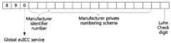 도 2를 참조하면, eUICC는 eUICC ID에서 MII(Major industry identifier)의 값으로 "89"를 사용하며, 이는 통신 목적으로 할당된 것이다. 또한 세번째 캐릭터인 '0'은 글로벌 eUICC 서비스를 표시하며, 그 외에도 제조사 식별자 번호, 제조사 사설 번호, 룬 점검 숫자(Luhn Check digit)를 포함할 수 있다.Referring to FIG. 2, the eUICC uses "89" as the value of the major industry identifier (MII) in the eUICC ID, which is allocated for communication purposes. In addition, the third character '0' indicates a global eUICC service, and may also include a manufacturer identifier number, a manufacturer private number, and a runn check digit.