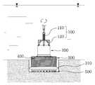 한편, 전술한 방법으로 형성된 굴착장치는 회전하며 일정 깊이로 지반의 토양에 파고들며 해저에 안착되도록 한다. 다만, 해수가 스며들지 않는 깊이로 안착되도록 하는게 바람직하다.On the other hand, the excavation device formed by the above-described method is rotated to dig into the soil of the ground to a certain depth to be seated on the sea floor. However, it is desirable to allow the seawater to settle to a depth that does not penetrate.