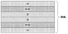 도 5에 도시된 바와 같이, 유기발광다이오드의 발광층(EML)은 하부부터 상부까지 호스트 영역(H), 호스트 및 도판트가 혼합된 혼합 영역(H+D), 도판트 영역(D), 도판트 영역(D), 호스트 및 도판트 영역가 혼합된 혼합 영역(H+D) 및 호스트 영역(H) 순으로 증착된 계층을 가질 수 있다.As illustrated in FIG. 5, the light emitting layer EML of the organic light emitting diode includes a host region H, a mixed region H + D in which a host and a dopant are mixed, a dopant region D, and a dopant from bottom to top. The base layer D may have a layer deposited in the order of the mixed region H + D and the host region H in which the host and dopant regions are mixed.