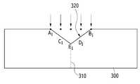 이와 같은 레이저 조사에 의해, 기판(300)의 상부면에는 단면이 V 자 형상의 제1 홈(320)이 형성된다.  제1 홈(320)의 깊이는 제1 절단 포인트(E1)에 대응하는 부분이 가장 깊다.  또한, 제1 홈(320)의 깊이는 제1 절단 포인트(E1)에 제1 좌외각 포인트(A1) 및 제1 우외각 포인트(B1)로 갈수록 얕아진다.  제1 홈(320)의 단면은 절단선(310)을 기준으로 대칭을 이룬다.The