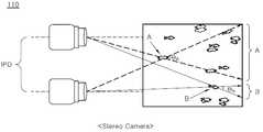 상기 스테레오 카메라(stereo camera)는 도 3을 참조하면, 두 개의 2차원 이미지 센서를 결합하여 만든 입체 영상으로 일반적인 3차원 깊이 인식 센서 방식이 적용된다. 측정할 대상자와의 거리를 측정하기 위해 한 쌍의 동일한 카메라를 사용하여 카메라들 사이의 시점 불일치를 이용하게 된다. 이러한 접근법에서 두 대의 카메라의 시선 중심은 깊이 측정에 필요한 시차를 생성하기 위해 기준선 또는 IPD(Inter Pupillary Distance)로 구분하며, 일반적으로 카메라의 광학축은 서로 평행하고 원근감이 있는 평면과 직각을 이룰 수 있다. 주어진 피사체 즉 대상자의 거리에 대해 IPD(Inter Pupillary Distance)는 카메라 쌍에 의해 보이는 바와 같이 피사체의 각도 간격 θ를 결정하고, 이에 따라 시차 검출에 중요한 역할을 한다. 보다 효과적인 깊이 차별이 가능하고 작동범위를 규정하며 다양한 피사체 거리에서의 깊이 해상도 한계에도 영향을 미치게 된다.Referring to FIG. 3, the stereo camera is a stereoscopic image created by combining two two-dimensional image sensors, and a general 3D depth recognition sensor method is applied. In order to measure the distance from the object to be measured, a pair of identical cameras are used to use a viewpoint mismatch between the cameras. In this approach, the centers of view of the two cameras are divided into a baseline or an inter-pupillary distance (IPD) to create the parallax required for depth measurement, and the optical axes of the cameras are generally parallel to each other and perpendicular to the perspective plane. . For a given subject, that is, the distance of the subject, IPD (Inter Pupillary Distance) determines the angular interval θ of the subject as seen by the camera pair, and thus plays an important role in parallax detection. More effective depth discrimination is possible, it defines the operating range and affects the depth resolution limit at various subject distances.