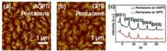 도 8에 보이는 바와 같이 모든 펜타센 필름은 0.5㎛의 평균 입자 크기를 갖는 전형적인 수지상 형태를 나타냈다. 펜타센 반도체 막으로부터 얻어진 XRD 프로파일은 AGPTi 및 GPTi 표면 상에 우선적으로 배향된 결정을 포함하였다. 도 8의 (c)는 양 유전체층 상에 성장된 펜타센 필름으로부터 얻어진 평면 외 XRD 패턴을 나타낸다. 모든 샘플은 펜타센 결정의 ab면이 기판에 평행하게 배향되는 패턴(00l)을 나타내었다. 각 기판 위에 증착된 Pentacene 결정은 박막 단계로 잘 성장하였다. 반도체 결정 성장은 유전체 벌크 특성보다는 유전체 표면에 의해 크게 영향을 받기 때문에, 유전체 표면에 관계없이 피크 강도는 유사했다.As shown in FIG. 8, all pentacene films exhibited a typical dendritic form with an average particle size of 0.5 μm. The XRD profile obtained from the pentacene semiconductor film included crystals preferentially oriented on the AGPTi and GPTi surfaces. Fig. 8(c) shows an out-of-plane XRD pattern obtained from a pentacene film grown on both dielectric layers. All samples showed a pattern (00l) in which the ab side of the pentacene crystal was oriented parallel to the substrate. Pentacene crystals deposited on each substrate grew well in the thin film stage. Since semiconductor crystal growth is significantly affected by the dielectric surface rather than the dielectric bulk properties, the peak intensity was similar regardless of the dielectric surface.