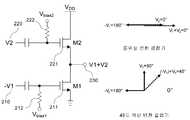 도 4에서 제1트랜지스터(211)와 제2트랜지스터(221)에 흐르는 드레인 전류는 각각,식으로 나타낼 수 있다. 이 때, 두 트랜지스터가 동일한 경우 두 트랜지스터에서 흐르는 드레인 전류는 같으므로 출력은 Vout=V1+V2으로 나타난다. 위상신호 -V1= -Acos(ωt+0°) = Acos(ωt+180°)이고, 위상신호 V2= Acos(ωt+90°)일 때, Vout= A(2*cos ()*cos(-45°) = A * cos(ωt+45°)가 나타난다.In FIG. 4, drain currents flowing through the