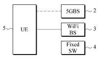 도 2a는 사용자가 5G를 통해서 시그널링과 데이터를 모두 사용할 때, 도 2b는 5G를 통해 시그널링을 하고 WiFi의 데이터를 사용할 때, 도 2c는 5G를 통해 시그널링을 하고 유선(Fixed) 데이터를 사용할 때, 도 2d는 5G를 통해 시그널링을 하고 5G와 WiFi의 데이터를 함께 사용하는 경우, 도 2e는 5G를 통해 시그널링을 하고 5G와 유선(Fixed)의 데이터를 함께 사용하는 경우를 각각 나타낸다. 5GBS(2)/WiFiBS(3)/FixedSW(4)로부터 시그널링 경로는 UCE로 연결되고, 데이터 경로는 CGW로 연결된다.FIG. 2A shows when a user uses both signaling and data through 5G, FIG. 2B shows when signaling through 5G and data of WiFi is used, and FIG. 2C shows when signaling through 5G and using fixed data, 2D shows a case of signaling through 5G and using 5G and WiFi data together, and FIG. 2E shows a case of signaling through 5G and using 5G and fixed data together. The signaling path from 5GBS(2)/WiFiBS(3)/FixedSW(4) is connected to UCE, and the data path is connected to CGW.