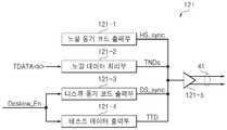 노말 모드에서 노말 동기 코드 출력부(121-1)는 노말 동기 코드(HS_sync)를 생성하여 데이터 채널(41)로 출력하고, 노말 데이터 처리부(121-2)는 병렬의 노말 데이터(TDATA<k>)를 수신하여 직렬의 노말 데이터(TNDs)로 변환하여 출력한다.In the normal mode, the normal synchronization code output unit 121-1 generates a normal synchronization code (HS_sync) and outputs it to the