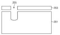 도 6a를 참조하면, 반도체 기판(201) 상부에 프로그램 게이트 형성을 위한 마스크(203)를 형성하고, 마스크(203)에 의해 노출된 반도체 기판을 식각하여 프로그램 게이트 형성을 위한 트랜치(205)를 형성한다. 이때, 트랜치(205)의 프로파일을 각지게 형성하여 모서리에 필드가 집중되어 게이트 절연막(미도시)이 잘 파열되도록 하는 것이 바람직하다.6A, a