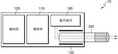 한편, 에어로졸 생성 장치(10)는 배터리(120), 제어부(110) 및 히터(130) 외에 범용적인 구성들을 더 포함할 수 있다. 예를 들어, 에어로졸 생성 장치(10)는 시각 정보의 출력이 가능한 디스플레이 및/또는 촉각 정보의 출력을 위한 모터를 포함할 수 있다. 또한, 에어로졸 생성 장치(10)는 적어도 하나의 센서(퍼프 감지 센서, 온도 감지 센서, 궐련 삽입 감지 센서 등)를 포함할 수 있다. 또한, 에어로졸 생성 장치(10)는 궐련(200)이 삽입된 상태에서도 외부 공기가 유입되거나, 내부 기체가 유출 될 수 있는 구조로 제작될 수 있다.Meanwhile, the