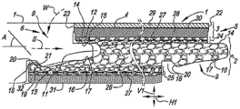 - 결합 수단 (9) 의 적어도 한 쌍의 수평 활성 로킹면 (20, 21) 이 본 발명의 기판 (2) 에서 실현된다는 특징 및/또는 결합 수단 (9) 의 적어도 한 쌍의 수평 활성 로킹면 (22, 23) 이 적어도 부분적으로 그리고 바람직하게 전부 상부층 (3) 에 실현된다는 특징;-At least a pair of horizontal active locking surfaces 20, 21 of the engaging means 9 are realized in the