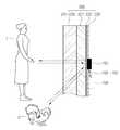 결과적으로 RF센서(150)에서 발산된 무선 주파수 감지신호는 관통공(232)을 통과 한 후, 전면의 액정표시패널(200)를 투과하여 액정표시패널 (200) 전방으로 방출된다. 이때, 액정표시패널 전방의 물체, 예를 들면 사용자(1)나 애완견(2)에 부딪혀 반사되는 반사파는 다시 액정표시패널(200) 및 관통공(232)에 설치된 수신부를 통하여 수신된다.As a result, the radio frequency detection signal emitted from the