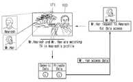 디스플레이 장치(100)가 내부 사용자 <Amaresh>의 프로파일 정보에 등록된 외부 사용자 <Mr.Ali>의 모바일 폰(500)로부터 빅 데이터의 접근 요청을 수신한 경우, 디스플레이 장치(100)는 외부 사용자 <Mr.Ali>의 모바일 폰이 내부 사용자 <Amaresh>의 일반 데이터에 접근 가능함을 알리는 <Mr.Ali>의 얼굴 이미지를 표시할 수 있다. 또한, 외부 사용자 <Mr.Ali>의 모바일 폰은 내부 사용자 <Amaresh>의 얼굴 이미지를 표시할 수 있다. 내부 사용자 <Amaresh>의 디스플레이 장치(100)는 <Mr.Ali>의 모바일 폰에 저장된 <Mr.Ali>의 일반 데이터에 접근 가능하다.