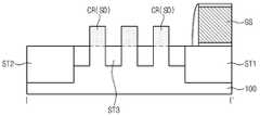 상기 게이트 구조체들(GS)이 형성된 결과물 상에 이온 주입 공정이 수행되어 소스/드레인 영역들(SD)이 형성될 수 있다. 상기 활성 부분들(CR) 중 상기 게이트 구조체들(GS)에 의하여 덮인 부분은 이온 주입 공정이 수행되지 않을 수 있다. 즉, 상기 이온 주입 공정은 상기 게이트 구조체들(GS)을 이온 주입 마스크로 사용하여 수행될 수 있다. 그 결과, 하나의 활성 부분(CR)은 상기 소스/드레인 영역(SD)이 형성된 부분과 상기 소스/드레인 영역(SD)이 형성되지 않은 부분들이 반복된 구조가 될 수 있다.The source/drain regions SD may be formed by performing an ion implantation process on the resultant product on which the gate structures GS are formed. A portion of the active portions CR covered by the gate structures GS may not be subjected to an ion implantation process. That is, the ion implantation process may be performed using the gate structures GS as an ion implantation mask. As a result, one active portion CR may have a structure in which a portion in which the source/drain regions SD are formed and portions in which the source/drain regions SD are not formed are repeated.