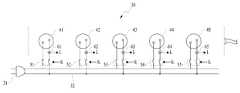또한, 접속구(40)에 연결된 전선(32) 상에 스위치(50), 및, 전류계(60)가 구비된다. 스위치(50), 및 전류계(60) 각각은 하나의 접속구(40)에 연결되어, 해당 접속구(40)의 전원을 차단하거나, 전류를 측정한다. 이하에서, 각각 개별 스위치의 도면부호를 51,52,53,54,55로 표기하고, 각각 개별의 전류계의 도면 부호를 61,62,63,64,65로 표기한다.In addition, a switch 50 and an ammeter 60 are provided on the