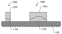 상기 방법은 도 10의 블록 1062에서 임프린트된 폴리머층(1100)의 돌출부(1122, 1124 및 1126)를 제거하는 단계를 더 포함할 수 있다.  임프린트된 폴리머층(1100)의 돌출부(1122, 1124, 및 1126)는 잔류층(842)을 제거하는 단계와 관련하여 앞서 설명된 바와 같은 기술 및 기체 중 임의의 것을 사용하여 제거될 수 있다.  마스킹 부재(1442)는 임프린트된 폴리머층(1100)의 부분(1143) 및 에칭 저항층(1200)의 부분(1242)을 포함하며, 마스킹 부재(1444)는 임프린트된 폴리머층(1100)의 부분(1145) 및 에칭 저항층(1200)의 부분(1244)을 포함한다.The method may further include removing the