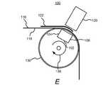 이제 도 1C 내지 도 1E를 참조하면, 본 개시내용의 추가의 실시예에 따른 자성-배향 가능한 박편을 배향시키기 위한 장치(100)의 개략도가 각각 도시되어 있다. 도 1C에 도시된 바와 같이, 기재(116)는 가요성 기재일 수 있고, 반경(132)을 가진 롤러(130)에 의해 지지될 수 있다. 롤러(130)는 비자성 재료, 예를 들어, 플라스틱 재료, 고무 재료, 세라믹 재료 등으로 형성될 수 있다. 자성-배향 가능한 박편을 함유하는 유체 캐리어(118)는 기재(116)의 상부 표면(예컨대, 실질적으로 자석(102 및 103) 및/또는 복사선원(120) 및 실질적으로 반대쪽 롤러(130)와 대면하는 기재의 표면) 상에 제공될 수 있다. 도 1C에 도시된 장치(100)는, 대향하는 극(104 및 106)이 롤러(130)가 화살표(136)로 표시된 방향으로 회전함에 따라서 자계를 형성하되 이 자계를 통해서 기재(116)의 부분이 공급되도록 롤러(130)에 관하여 위치결정된 자석(102 및 103)을 포함할 수 있다. 선(138)으로 표시될 수 있는 자계는, 각각의 방향이 자계의 중간에서 서로 실질적으로 평행한 벡터힘을 포함할 수 있으며, 복사선원(120)은 자석(102)과 (103) 사이의 중심 위치에 가까운 유체 캐리어(118) 상에 에너지를 인가하도록 위치결정될 수 있다. 따라서, 도 1C는 기재(116)가 적어도 거의 선형 자계(낮은 정도의 자계선 곡률)의 북-남 기본 방향을 따라서 즉석으로 이동하는 실시예를 도시한다.Referring now to FIGS. 1C-1E, a schematic diagram of an