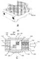 도 6B는, 본 개시내용의 실시예에 따른, 도 6A에 묘사된 유체 캐리어의 영역에 함유된 자성-배향 가능한 박편의 간략화된 등각도;
