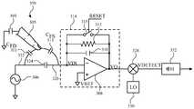 도 3b는 저항성 및 용량성 피드백 요소들 양측 모두가 활용되는 일반적인 경우를 도시한다.  감지 신호(Vin으로 지칭됨)는 연산 증폭기(308)의 반전 입력 내로 입력될 수 있고, 연산 증폭기의 비-반전 입력은 기준 전압 Vref에 결합될 수 있다.  연산 증폭기(308)는 그의 출력을 전압 Vo로 구동하여 Vin을 Vref와 실질적으로 동일하게 유지시킬 수 있고, 따라서, Vin을 일정하게 유지시키거나 사실상 접지된 것으로 유지할 수 있다.  따라서, 저항기(312) 및/또는 커패시터(310)로 구성된 감지 회로(314)의 이득은, 주로, 상호-용량(324)과 피드백 임피던스 비율의 함수일 수 있다.  감지 회로(314)의 출력 Vo는 곱셈기(328) 내에 공급됨으로써 필터링될 수 있고 헤테로다인 또는 호모다인될 수 있는데, 여기서 Vo는 국부 발진기(330)와 곱해져서 Vdetect를 생성하게 할 수 있다.  Vdetect는 필터(332) 내에 입력될 수 있다.  당업자는 필터(332)의 배치가 변화될 수 있다는 것을 인식할 것이고; 따라서, 도시된 바와 같이, 필터가 곱셈기(328) 뒤에 배치될 수 있거나, 또는 2개의 필터들, 즉 곱셈기 앞의 하나의 필터 및 곱셈기 뒤의 다른 하나의 필터가 채용될 수 있다.  일부 예들에서는, 필터가 전혀 없을 수 있다.  Vdetect의 직류(DC) 부분은 터치 또는 근접 이벤트가 발생했는지의 여부를 판정하는 데 사용될 수 있다.  도 3b는 곱셈기(328)에서의 복조가 아날로그 도메인에서 발생함을 나타내지만, 출력 Vo는 ADC에 의해 디지털화될 수 있고 블록들(328, 332, 330)은 디지털 방식으로 구현될 수 있음(예컨대, 328은 디지털 복조기일 수 있고, 332는 디지털 필터일 수 있으며, 330은 디지털 NCO일 수 있음)에 유의한다.Figure 3b shows a general case in which both resistive and capacitive feedback elements are utilized. A sense signal (referred to as Vin) may be input into an inverting input of an
