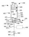 예시된 바와 같이, 용기(452)는 또한 내부 및 외부 표면(542, 544)을 갖는 스토퍼 또는 피스톤(540)을 포함할 수 있다.  피스톤(540)은 벽(460)에 의해 형성된 단부(478) 내에 수용될 수 있고, 용기(452)의 단부(476, 478) 사이에서 보어(480)를 따라 이동될 수 있다.  이런 실시예에 따라서, 약물 제품(520)이 내부에 배치되는 저장부(510)는 피스톤(540)과 벽(460, 490)의 내부 표면(462, 494, 542)에 의해 형성될 수 있다.As illustrated, the