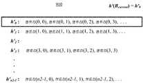 도 9a 내지 도 9c는 반복적인 해시 기반의 블록 매칭을 위한 후보 블록을 편제하는 예시적인 데이터 구조체를 예시하는 테이블이다.
