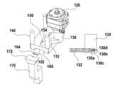 아울러, 상기 고정베이스(110)의 일측면에는 구동모터(120)가 고정되고, 상기 구동모터(120)의 모터축에는 상기 고정베이스(110)를 관통한 동축(130)이 고정되며, 상기 동축(130)의 하단 일부에는 탄력적으로 출몰가능하게 링커(130)가 조립되어 전체적으로 'ㄴ' 형상을 갖도록 구성된다.In addition, a