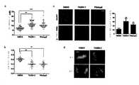 도 33은 TASIN-1이 DLD1 세포에서 유사분열 동안 유사분열 방추, 염색체 정렬 및 K-섬유 조직화를 방해하는 것을 도시한 것이다.  (a) 중기판의 폭.  (b) 중기판의 방추 폭/전체 세포 폭의 비율.  Pitstop2는 방추 분열을 위한 양성 대조군이다.  각 점은 세포를 나타낸 것이다.  평균은 중질의 검정색 라인에 의해 지시된다.  (c) α-튜불린(적색), HURP(녹색), 및 DNA(DAPI, 청색)에 대해 염색된 중기 동시발생 세포에 대한 예시적인 이미지.  그래프는 비정상 HURP 국소화를 갖는 TASIN-1 처리된 세포의 백분율을 나타낸 것이다.  데이타는 3개의 생물학적 삼배체(triplicate)로부터 기록된 50개의 세포의 평균±s.e.m.를 나타낸 것이다.  스튜던트 t-시험, **P<0.001. (d) TASIN-1 처리는 적색 화살표에 의해 지시된 바와 같은 래깅 마이크로솜 및 후기 브릿지를 유발시킨다.  모든 스케일 바: 10 μM.