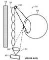 따라서, 만족스러운 FOV를 제공하기 위해, 근안 광필드 디스플레이를 채용하는 종래의 근안 디스플레이 시스템은 상대적으로 제한된 아이박스를 갖는 것이 일반적이며, 이는 잠재적인 사용자들의 모집단에서의 동공간 거리(inter-pupillary distance: IPD)의 변동성 및 디스플레이에 대한 사용자 눈의 정확한 포지셔닝의 변동성이라는 관점에서 종종 문제가 되며, 이들 중 하나는 아이박스의 경계선들 외곽에 사용자의 동공이 속하게 만들 수 있는바, 따라서 사용자의 눈에 디스플레이되도록 의도된 이미지의 적어도 일부의 폐색(occlusion)을 유발할 수 있다.Thus, in order to provide a satisfactory FOV, conventional near-eye display systems employing near-eye lightfield displays typically have relatively limited eyeboxes, which are inter-pupillary distances in a population of potential users. : IPD) is often problematic in terms of variability in the precise positioning of the user's eye with respect to the display, one of which can cause the user's pupil to fall outside the borders of the eyebox, and thus the user's eye. may cause occlusion of at least a portion of the image intended to be displayed.