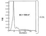 각각의 바이어스 RF 전력 펄스 동안 플라즈마 전위 증가 레이트는 플라즈마 내의 IEADF에 대응하는 영향을 갖는다. 따라서, 차단 커패시터 (BC) 의 커패시턴스 설정의 변화들은 플라즈마 내의 IEADF의 변화들에 대응한다. 따라서, 차단 커패시터 (BC) 는 플라즈마 내의 IEADF를 제어하도록 사용될 수 있다. 이러한 효과는 각각 도 4a, 도 5a, 및 도 6a의 펄스드 바이어스 RF 전력 동작들에 대응하는 도 4b, 도 5b, 및 도 6b에 예시된다. 도 4b는 본 발명의 일 실시예에 따라, 100 ㎋의 차단 커패시터 (BC) 커패시턴스 설정으로, 도 4a의 펄스드 바이어스 RF 전력 동작에 대응하는 플라즈마 내의 이온 에너지 분포 함수를 도시한다. 도 5b는 본 발명의 일 실시예에 따라, 500 ㎋의 차단 커패시터 (BC) 커패시턴스 설정으로, 도 5a의 펄스드 바이어스 RF 전력 동작에 대응하는 플라즈마 내의 이온 에너지 분포 함수를 도시한다. 도 6b는 본 발명의 일 실시예에 따라, 1000 ㎋의 차단 커패시터 (BC) 커패시턴스 설정으로, 도 6a의 펄스드 바이어스 RF 전력 동작에 대응하는 플라즈마 내의 이온 에너지 분포 함수를 도시한다.The rate of plasma potential increase during each bias RF power pulse has a corresponding effect on the IEADF in the plasma. Accordingly, changes in the capacitance setting of the blocking capacitor BC correspond to changes in the IEADF in the plasma. Thus, the blocking capacitor BC can be used to control the IEADF in the plasma. This effect is illustrated in FIGS. 4B, 5B, and 6B corresponding to the pulsed bias RF power operations of FIGS. 4A, 5A, and 6A, respectively. FIG. 4B illustrates the ion energy distribution function in the plasma corresponding to the pulsed bias RF power operation of FIG. 4A with a blocking capacitor (BC) capacitance setting of 100 nA, in accordance with an embodiment of the present invention. FIG. 5B shows the ion energy distribution function in the plasma corresponding to the pulsed bias RF power operation of FIG. 5A with a blocking capacitor (BC) capacitance setting of 500 ㎋, in accordance with an embodiment of the present invention. 6B illustrates the ion energy distribution function in the plasma corresponding to the pulsed bias RF power operation of FIG. 6A with a blocking capacitor (BC) capacitance setting of 1000 ㎋, in accordance with an embodiment of the present invention.