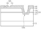 발광 구조체(120)는 제1 도전형 반도체층(121)의 상면이 부분적으로 노출된 영역을 포함할 수 있다. 상기 제1 도전형 반도체층(121)의 상면이 부분적으로 노출된 영역은 제2 도전형 반도체층(125)과 활성층(123)이 부분적으로 제거되어 제공될 수 있으며, 도시된 바와 같이, 제2 도전형 반도체층(125)과 활성층(123)을 관통하는 홀(120a)을 통해 제1 도전형 반도체층(121)의 상면이 부분적으로 노출될 수 있다. 홀(120a)은 경사진 측면을 가질 수 있다. 다만, 본 발명이 이에 한정되는 것은 아니며, 제1 도전형 반도체층(121)이 부분적으로 노출되는 영역의 형태 및 위치는 다양하게 변형될 수 있다.The