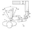 도 2a 및 2b는 누워 있는 환자(P) 위로 뻗은 상이한 피치를 가지는 배열의 암(106)을 도시한다. 암(106)의 피치는 비교적 수직인 평면에서 측정된 암(106)의 각도이다. 이 피치는 도 2a 및 2b에 도시된 요우 조인트(166)를 통해 측정될 수도 있고, 또는 다른 곳에서 측정될 수도 있다. 예를 들어, 피치는 특정 조인트 또는 링키지를 통한 것을 대신하여 암(106)의 대체적인 전체 각도를 따라 측정될 수 있다. 암(106)의 각도에 따라, 피치는 도 2b에 도시된 것처럼 더 깊거나 더 높을 수 있고, 또는 도 2a에 도시된 것처럼 더 낮거나 더 얕을 수 있다. 도 2a는 요우 조인트(166)를 통해 뻗어 있는 기준선(202)으로 표시된 얕은 각도의 암(106)을 도시한다. 도 2a의 선(208)은 환자(P)의 해부구조적 구멍에 대한 암(106)의 이동 한계(208)를 나타낸다. 이동 한계(108) 사이의 각도(A1)는 환자로부터 암을 제거하지 않고 암(106)이 취할 수 있는 이동 또는 범위를 정의한다. 도시된 바와 같이, 도 2b에 도시된 얕은 각도 배열에서, 이동 한계(208)는 수직으로부터 말단 방향 및 근단 방향 양쪽으로 거의 대략 20도의 각도인데, 이는 대략 40도의 각도(A1)로 표현되는 전체 이동 범위를 제공한다. 이동 한계(208)는 전형적으로 각각의 링크, 각각의 링크에 있는 모터의 물리적 한계, 또는 다른 물리적 한계에 의해 정해진다. 그러나, 몇몇 실시예에서, 이동 한계(208)는 전기적 제어 또는 다른 수단에 의해 정해진다. 이러한 40도의 이동 범위는 단지 이동 범위의 한 예일 뿐이고, 실제 이동 범위는 더 크거나 작을 수 있고, 암의 물리적 구성 및/또는 전자적 한계에 의해 정해질 수 있다.Figures 2a and 2b show an arrangement of