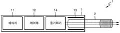 한편, 에어로졸 생성 장치(1)는 배터리(11), 제어부(12), 히터(13) 및 증기화기(14) 외에 범용적인 구성들을 더 포함할 수 있다. 예를 들어, 에어로졸 생성 장치(1)는 시각 정보의 출력이 가능한 디스플레이 및/또는 촉각 정보의 출력을 위한 모터를 포함할 수 있다. 또한, 에어로졸 생성 장치(1)는 적어도 하나의 센서를 포함할 수 있다. 또한, 에어로졸 생성 장치(1)는 에어로졸 생성 물품(2)이 삽입된 상태에서도 외부 공기가 유입되거나, 내부 기체가 유출 될 수 있는 구조로 제작될 수 있다.Meanwhile, the