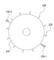 회전부(200)는, 원판상의 회전판(210)과, 상기 돌출부(130-1,2)가 돌출되었을 때 돌출부에 접촉하여 회전판(210)의 이동을 저지하며  상기 회전판(210)의 원주방향을 따라 일정 간격으로 배치된 복수의 걸림턱(230)을 포함하여 이루어진다.The