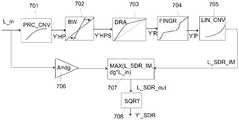 - HDR 이미지의 가장 어두운 휘도들의 서브세트(502)를 표준 동적 범위 이미지의 대응하는 가장 어두운 루마들(Y'_in)의 범위로 변환하기 위해 대안 휘도 변환 함수를 입력 HDR 이미지의 휘도들 또는 루마들에 대안 계산으로서 적용하도록 배열되는 이득 제한기(707)를 포함한다.- an alternative luminance transform function to convert a subset of the darkest luminances of the