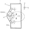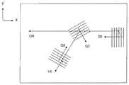 도 3은 3개의 선형 격자들 H0, H1, H2를 포함하는 웨이브가이드 12의 투시도이다.  도 4에 도시된 바와 같이 입력 격자 H0의 그루브들은 y 축과 평행하고, 격자 피치 p를 가지며 웨이브가이드 12의 제1 표면 상에 있는 x-y 평면에 놓여 있다.  선형 격자 H1은 x-y 평면 상에서 입력 격자 H0로부터 좌우로(laterally) 분리되어 있고, 웨이브가이드 12의 제2 표면에 놓여있다.  도 5에 도시된 바와 같이 격자 H1의 그루브들은 x 축에 대해 30도 방향을 향하고, 격자 피치 p를 가지며 x-y 평면에 놓여 있다.  선형 격자 H2는 x-y 평면 상에서 H1과 겹쳐져 있고, 격자 H2와는 반대로 웨이브가이드 12의 제1 표면에 놓여있다.  그러므로 교차된 격자 H1, H2는 z축에 대한 웨이브가이드 12의 두께에 의하여 분리된다.  도 6에 도시된 바와 같이, 격자 H2의 그루브들은 x축에 대해 -30도 방향을 향하고, 격차 피치p를 가지며 x-y 평면상에 놓여있다.