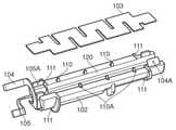 도 3에서 보여질 수 있는 바와 같이, 제 1 및 제 2 전기 접촉 엘리먼트들(104, 105)은 하부 크래들 컴포넌트(102)에 장착되었고 그리고 가열 엘리먼트(103)는 적소에 넣어지도록 준비된 하부 크래들 컴포넌트(102) 위에 표현된다.  제 2 전기 접촉 엘리먼트(105)는 하부 크래들 컴포넌트(102)의 제 2 단부(도 3의 배향에 대해 최좌측 단부)에 장착된다.  하부 크래들 컴포넌트(102)는 플라스틱 바디 부분들에 전기 전도체들을 장착하기 위한 종래의 제조 기법들에 따라 제 2 전기 접촉 엘리먼트(105)의 제 1 부분의 모양을 수용 및 매치하도록 프로파일링(profile)된다.  도면에 개략적으로 표현된 바와 같이, 제 2 전기 접촉 엘리먼트(105)의 하나의 단부는 가열 엘리먼트(103)의 전기 접촉 연장부들(103B) 중 하나를 수용하기 위한 제 2 전기 접촉 엘리먼트 클램프(clamp) 부분(105A)을 제공하는 반면 제 2 전기 접촉 엘리먼트(105)의 다른 단부는 하부 크래들 컴포넌트(102)로부터 멀어지게 연장된다.  제 1 전기 접촉 엘리먼트(104)는 리세스(120)의 벽에 인접한 하부 크래들 컴포넌트(102)의 길이를 따라 연장하도록 장착된다.  제 2 전기 접촉 엘리먼트(105)에 대해, 제 1 전기 접촉 엘리먼트(104)의 하나의 단부는 도면에 개략적으로 표현된 바와 같이 하부 크래들 컴포넌트(102)의 제 2 단부로부터 멀어지게 연장된다.  제 1 전기 접촉 엘리먼트(104)의 다른 단부는 가열 엘리먼트(103)의 전기 접촉 연장부들(103B) 중 다른 연장부를 수용하기 위하여 하부 크래들 컴포넌트(102)의 제 1 단부(도 3에서 최우측 단부)에 배열된 제 1 전기 접촉 엘리먼트 클램프 부분(105A)을 제공한다.As can be seen in FIG. 3 , the first and second
