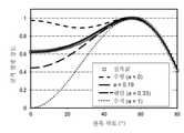 도 39는 발광 소자 6-1의 검출기의 각도(θ)에 대한 EL 발광 스펙트럼 면적 강도(실측 및 계산)를 나타낸 도면.