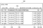 도 7은 본 발명의 일실시예에 있어서, 음성 목록을 편집하는 기능의 예를 도시한 도면이다.  도 7은 컨텐츠 편집 툴(320)이 제공할 수 있는 음성 목록의 편집 기능의 화면 예(700)를 나타내고 있다.  제1 점선박스(710)는 음성 목록에 포함된 개별 음성에 대해 설정된 음성 타입(일례로, 도 7의 보이스 폰트)을, 제2 점선박스(720)는 개별 음성들의 타임라인에서의 시작 시간을, 제3 점선박스(730)는 개별 음성들에 대응하는 텍스트의 내용을, 제4 점선박스(740)는 개별 음성들의 길이를 각각 나타내고 있다.  이때, 컨텐츠 편집 툴(320)은 제1 점선박스(710)에 나타난 개별 음성별 음성 타입을 다른 음성 타입으로 변경하기 위한 기능을 제공할 수 있다.  또한, 컨텐츠 편집 툴(320)은 제3 점선박스(730)에 나타난 텍스트의 내용을 편집하기 위한 기능을 제공할 수 있다.  또한, 제5 점선박스(750)는 개별 음성들에 대한 미리 듣기를 위한 기능을, 제6 점선박스(760)는 개별 음성들을 삭제하기 위한 기능을 각각 나타내고 있다.  또한, 음성 목록의 편집 기능은 새로운 음성을 생성하기 위한 기능을 포함할 수도 있다.  제7 점선박스(770)는 새로운 음성의 생성을 위해, 음성 타입, 시작 시간 및 텍스트의 내용을 설정하기 위한 기능을 나타내고 있다.7 is a diagram illustrating an example of a function for editing a voice list according to an embodiment of the present invention. 7 shows an
