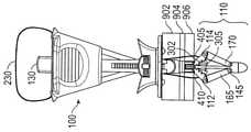 도 9a 및 도 9b는 봉합사 단부를 포획하는 상이한 스테이지들의 핸들(100)을 도시한다. 봉합사 단부(405,410)가 멤브레인(302,305)으로 전개된 후에(도 8g와 같이), 제어 버튼(130)은 눌려져서, 제어 로드(145)를 원위로 이동시켜서 캐처(110)를 폐쇄한다. 도 9a는 봉합사 단부를 포획하는 프로세스를 통해서 대략 중간에 있는 핸들(100)을 도시한다. 제어 버튼(130)이 눌려질 때, 멤브레인(302,305)은 캐처 요소[114,314(도 3) 및 112,312(도 3)] 사이에서 각각 접혀져서, 이들에 의해서 봉합사 단부(405,410)를 이동시킨다. 도 9b는 후퇴 구성에 있는 캐처(110)를 도시한다. 제어 버튼(130)은 완전히 눌려졌다. 이 구성에서, 캐처(110)는 아직 압축 위치에 있는, 슬라이더(115)의 압축력에 대한 저항력을 더이상 제공하지 않는다. 즉, 캐처(110)는 더이상 조직층(902,904,906)에 평탄 표면을 제공하지 않으며 용이하게 후퇴할 수 있다. 완전 후퇴 위치에서, 요소(114,314 및 112,312)는 각각의 봉합사 단부(405,410)를 체결한다. 또한 요소들(114,314 및 112,312)(도 6c, 도 8d 참조) 사이에 있는 선택형 치형체(140)는 봉합사 단부(405,410)에서의 유지력을 개선한다.9A and 9B show the