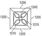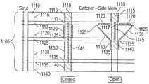 도 11은 개방 및 폐쇄 봉합사 캐처 구조체의 일부로서 평면도 및 단면도로 봉합사 캐처 구조체로부터의 지지대들의 일 실시예를 도시한다. 봉합사 캐처(1105)는 다수의 지지대(1110)를 수용할 수 있다. 각각의 지지대(1110)는 근위 조인트(상부 힌지)에 대한 근위 연결 부분(1115), 상부 지지대(1120), 중간 힌지(1125), 하부 지지대(1130), 원위(또는 하부) 힌지(1135) 및 원위 힌지(1135)에 대한 원위 연결 부분(1140)을 가질 수 있다. 힌지들은 활성 힌지, 기계식 힌지 또는 금속 와이어/플레이트 스프링 힌지일 수 있다. 지지대들은 금속(즉, 스테인레스 강), 플라스틱(즉, 플리프로필렌, 폴리카보네이트, 폴리우레탄, 나일론 또는 폴리에틸렌) 또는 임의의 다른 적당한 재료로 제조될 수 있다. 다수의 지지대들은 캐처를 형성하기 위하여 근위 조인트 뿐 아니라 원위 조인트에서 연동될 수 있다. 제어 로드(1145)는 캐처의 원위 연결 부분(1140)에 결합될 수 있고 봉합사 전달 장치의 근위 단부로 연장될 수 있다. 일 실시예에서, 제어 로드(1145)의 움짐임은 원위 연결 부분(1140)의 상하 이동을 구동하여, 결과적으로 봉합사 캐처를 개방(원위 상부 연결 또는 "전개")  또는 폐쇄(원위 하부 연결 또는 "후퇴")시킨다. 대안 실시예에서, 캐처 전개 기구는 근위 연결 부분(1115)을 제어함으로써 구동될 수 있다. 실시예에서, 전개 구성에 있을 때 캐처(1105)는 조직 압축력에 대한 저항력 부재로서 작용한다.11 shows one embodiment of supports from a suture catcher structure in top and cross-sectional views as part of an open and closed suture catcher structure.