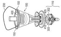 도 4a 내지 도 4c는 자동 봉합사 해제를 제공하는 핸들(100)의 일 실시예를 도시한다. 단일 봉합사의 2개의 단부들이 수술 개방부 안으로 전달되고 봉합사 전달 장치의 원위 단부에 보유될 때 근위 단부 부근의 봉합사 부분은 루프를 형성한다. 루프는 장치의 퇴거 중에 장치와 얽매일 수 있다. 기존의 폐쇄 장치는 수술자가 봉합사를 장치로부터 수동으로 분리될 수 있게 한다. 도 4a 내지 도 4c의 실시예는 봉합사(415)의 자동 해제를 용이하게 하는 내부 봉합사 탈출 슬롯(400)을 사용한다. 봉합사 탈출 슬롯(400)은 그 길이에 걸쳐 바늘 트랙(150,155)을 연결하여, 봉합사(415)가 핸들(100)을 통과하고 봉합사 출구 슬롯(160)을 빠져나오게 하는 슬롯을 제공한다. 도 4a에서, 봉합사 패서(200)는 바늘 트랙(155) 안에 삽입되고 샤프트(105)로부터 연장되어서 바늘 튜브(210)를 노출시킨다. 바늘 튜브(210)는 멤브레인(305)을 침투한 후의 상태로 도시된다. 봉합사(415)의 봉합사 팁(410)은 또한 멤브레인(305)을 통과하고, 봉합사 패서(200)의 팁에 의해서 운반된 상태로 도시된다. 제어 버튼(130)은 연장 상태로 도시된다. 따라서, 바늘 튜브(210)는 후크(205)를 커버하지 않고 봉합사 단부(410)는 [비록 바늘 팁은 멤브레인(305)에 의해서 도 4a에서 불명료하지만] 봉합사 패서(200)로부터 해제된다. 바늘 트랙(150)은 봉합사 단부(405)가 멤브레인(302)을 통과하고, 해제되며, 봉합사 패서(200)가 후퇴한 이후의 봉합사(415)를 나타낸다. 도 4a에 도시된 바와 같이, 양쪽의 봉합사 단부(405,410)는 멤브레인(302,305)에 의해서 보유된다. 봉합사 단부(405)로부터, 봉합사(415)는 바늘 트랙(150)을 통해서 상기 바늘 트랙으로부터 통과하고 핸들(100)에 걸쳐 루프를 만들고, 봉합사 패서(200)에 의해서 동반되고, 바늘 트랙(155)으로 진입한다. 도 4a 내지 도 4c에 있어서, 슬라이더(115)는 내부 봉합사 탈출 경로를 더욱 명확하게 설명하기 위해 도시되지 않는다.4A-4C show one embodiment of a