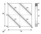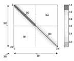 상기 도 3a를 참고하면, 그래프 300의 가로축 301은 송신 장치의 서브캐리어의 인덱스, 상기 그래프 300의 세로축 302는 수신 장치의 서브캐리어 인덱스를 나타낸다. 하나의 서브캐리어 인덱스는 하나의 물리적 서브캐리어 및 하나의 안테나 쌍의 조합에 의해 특정될 수 있다. 즉, 상기 서브캐리어 인덱스의 최대값은 안테나의 개수 및 서브캐리어의 개수에 따라 정해질 수 있다. 도 3a에 도시된 바와 같이, 가로축 301은 128개의 인덱스, 세로축 302는 128개의 인덱스를 가질 수 있다. 송신 장치의 안테나 개수는 2개, 수신 장치의 안테나 개수는 2개, 서브캐리어의 개수는 64개이고 따라서 송신단과 수신단은 모두 총 128개의 유효 서브캐리어들을 가질 수 있다. 송신 장치의 제1 안테나와 수신 장치의 제1 안테나 간의 유효채널은 제2 사분면 312, 송신 장치의 제1 안테나와 수신 장치의 제2 안테나 간의 유효채널은 제1 사분면 314, 송신 장치의 제2 안테나와 수신 장치의 제1 안테나 간의 유효채널은 제2 사분면 311, 송신 장치의 제2 안테나와 수신 장치의 제2 안테나 간의 유효채널은 제4 사분면 311일 수 있다. 선의 색깔이 진할수록 강한 신호의 세기를 의미하고, 선의 색깔이 연할수록 낮은 신호의 세기를 의미할 수 있다.Referring to FIG. 3A , the