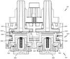 도 7에서 보여지는 회전식 결합 구성에 있어서는, 제1 기기 드라이버(610A) 및 제2 기기 드라이버(610B)는 한 방향으로 회전하는 동시에 기기 샤프트(620)는 반대 방향으로 회전한다.  예를 들어, 제1 기기 드라이버(610A) 및 제2 기기 드라이버(610B)가 시계 방향으로 회전할 경우, 기기 샤프트(620)는 반시계 방향으로 회전한다.  다른 구성에서는, 제1 기기 드라이버(610A) 및 제2 기기 드라이버(610B)가 서로 반대 방향으로 그리고/또는 1:1이 아닌 속도비로 회전하도록 회전 결합될 수 있다.In the rotational coupling configuration shown in FIG. 7 , the