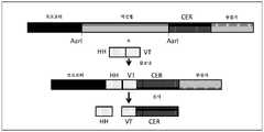 도 12a 및 도 12b: HDV-sgRNA 융합 발현 카세트를 제작하기 위한 고효율 클로닝 카세트의 예.  도 12-a는 프로모터 서열을 검정색 박스로, HDV 리보자임을 암호화하는 DNA 서열을 회색 박스로, 타입 II 제한 부위에 의해 플랭킹된(flanked) 클로닝 균주에 대해 역선별가능한 마커를 수평으로 해칭된 박스로, Cas9와 상호작용하기 위한 sgRNA의 CER 도메인을 검은 점선 박스로, 전사 종결자를 대각선으로 해칭된 박스로 도시한다.  가변 표적화 도메인을 암호화하는 DNA 서열 및 타입 II 제한 부위 (수직으로 해칭된 박스 VT)에 적절한 돌출부를 함유하는 DNA 듀플렉스가 플라스미드, DNA 리가제 및 타입 II 효소와 혼합되는 경우, 가변 표적화 도메인 (VT)을 암호화하는 DNA 서열이 역선별가능한 마커를 대체함으로써, HDV-sgRNA 발현 카세트 (프로모터-HDV-VT-CER-종결자)를 생성한다.  HDV-sgRNA 발현 카세트가 전사되는 경우, 이는 HDV 리보자임이 임의의 5' 서열 절단하는 RNA 전사물 (HDV-VT-CER 전사물)을 생성한다.  도 12-b는 Can1-1 표적 부위를 암호화하는 DNA 서열 및 플라스미드 pRF291로의 클로닝에 적절한 돌출부를 함유하는 이중 가닥 DNA 분자의 예를 (서열 번호: 99 및 서열 번호: 100의 올리고듀플렉스)를 도시한다.