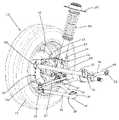 제3 주 서스펜션 요소는 스트럿(60)이다.  이는, 상부 마운트(62)를 통해 섀시에 부착되고 스트럿(60)의 하부 단부에 클램핑되는 그리고 두 장소에서 전방 측부 플랜지(24)에 볼트체결되는 브라켓(64)을 통해 허브 캐리어(20)에 부착되는 종래의 스프링 및 댐퍼 유닛이다.  따라서, 스트럿은 허브 캐리어를 대체로 직립 정렬 상태로 유지시키며, 휠과 지면의 접촉을 유지시키기 위해 휠(10)에 하향력을 제공하고, 휠(10)의 상향 및 하향 운동의 감쇠를 제공한다.The third main suspension element is a