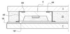특히 면(FA)과 면(FB) 사이에 관통(또는 블라인드) 개구를 갖는 PVB 적층 사이층은 다이오드보다 더 두꺼울 수도 있지만, 만일 그러하면 두께차는 너무 많은 공기 기포를 발생하는 위험을 야기하지 않기 위해 가능한 한 작을 것이다.The interlayer between PVB stacks, especially with through (or blind) openings between face FA and face FB, may be thicker than a diode, but if so, the thickness difference is as low as possible so as not to risk generating too many air bubbles. one will be small