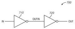 동작 시, 입력 신호(IN)가 인버터 회로(710)에 제공된다. 인버터 회로(710)는 입력 신호(IN)의 상보적 논리 레벨을 갖는 출력 신호(OUTIN)를 제공한다. 출력 신호(OUTIN)는 인버터 회로(720)에 입력 신호로서 제공된다. 인버터 회로(720)는 입력 신호(OUTIN)의 상보적 논리 레벨을 갖는 출력 신호(OUT)를 제공한다. 입력 신호(IN)를 반전하여 출력 신호(OUTIN)를 제공한 후 출력 신호(OUTIN)를 반전하여 출력 신호((OUT)를 제공한 결과, 리피터 회로(700)에 의해 제공되는 결과 출력 신호(OUT)는, 입력 신호(IN)와 동일한 논리 레벨을 갖고, 논리 레벨의 전체 전압으로 구동되었다. 입력 신호(IN)는 동일한 논리 레벨을 해당 논리 레벨의 전체 전압으로 구동함으로써 반복되었다.In operation, the input signal IN is provided to the